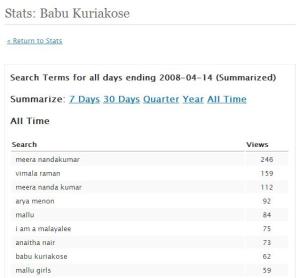 I am an expert on the kindness of women. Through my adult life I always had around me women who played the role of best friend, confidante, agony aunt, punching bag, anchor, inspiration…but this post is not about them, this post is about blog stats. Last week my page-views crossed 8000, thanks largely to the on-screen and off-screen adventures of Meera Nandan, Vimala Raman, Arya Menon, Anaitha Nair. The kindness of women!